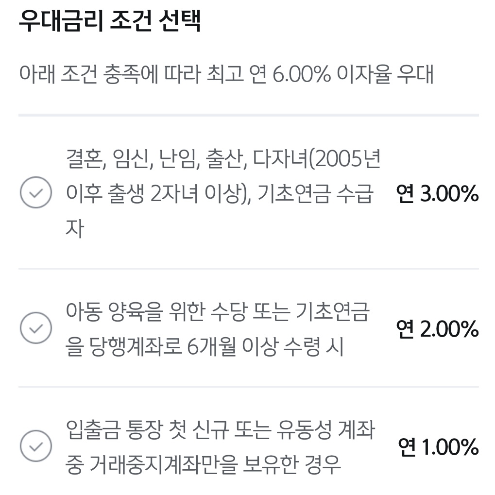 기본금리는 3% 이고, 아래 우대 금리 최대 6%까지 받으면 최대 9% 적금 가입이 가능합니다.