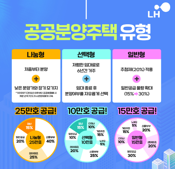 25만호는 신혼부부 40%(10만호), 생애최초 25%(62,500호), 일반공급 20%(5만호), 청년 15%(37,500호)로 나누어 공급합니다.