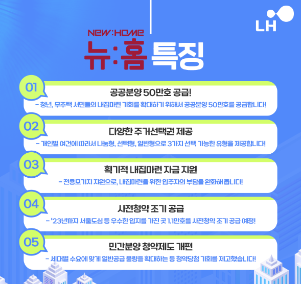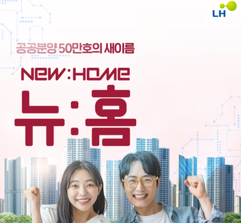 '뉴홈'은 한국토지주택공사에서 론칭한 '공공부양 50만호의 새이름' 입니다.