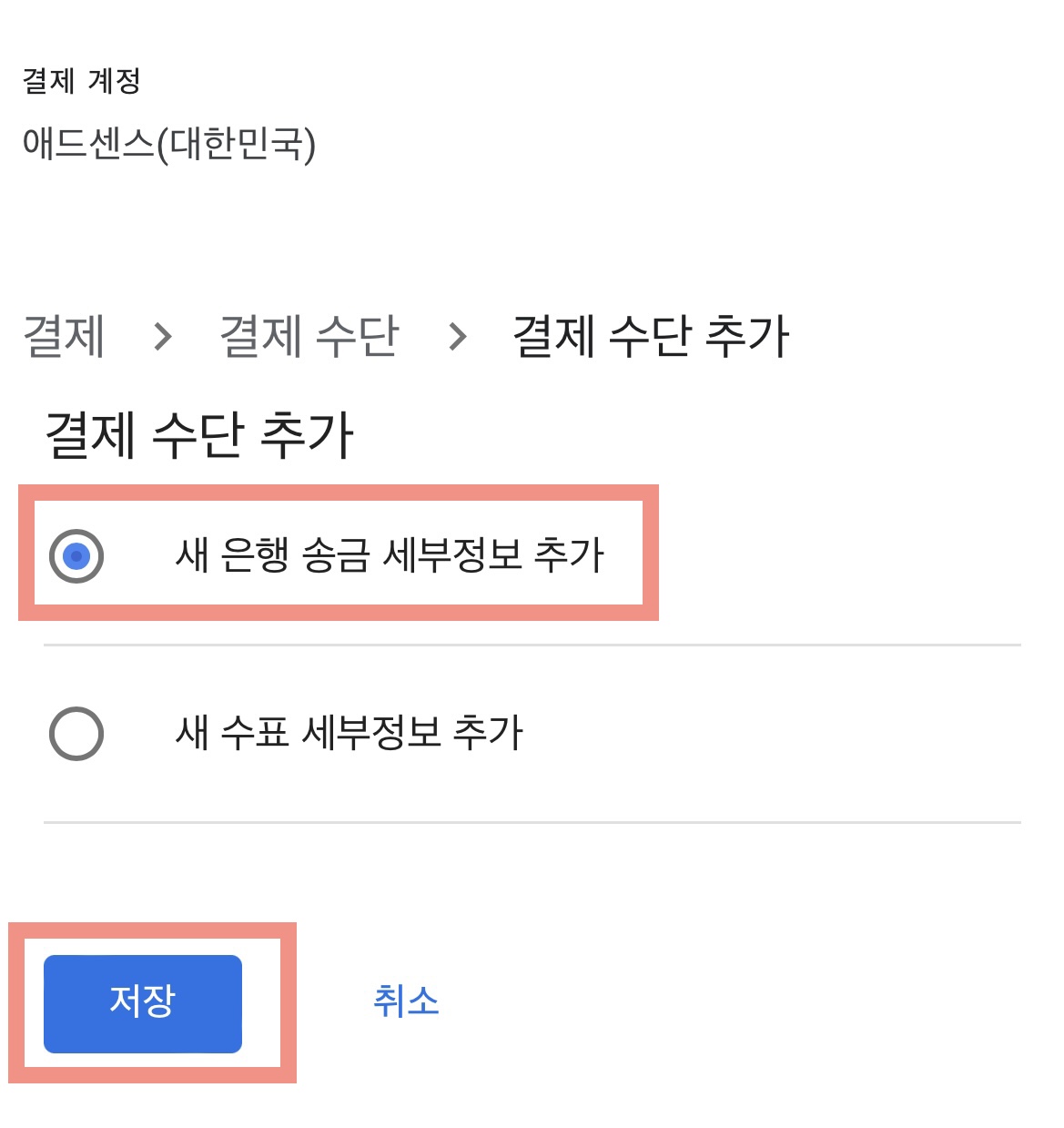 5. 새 은행 송금 세부정보 추가를 선택 후 '저장'을 눌러줍니다.
