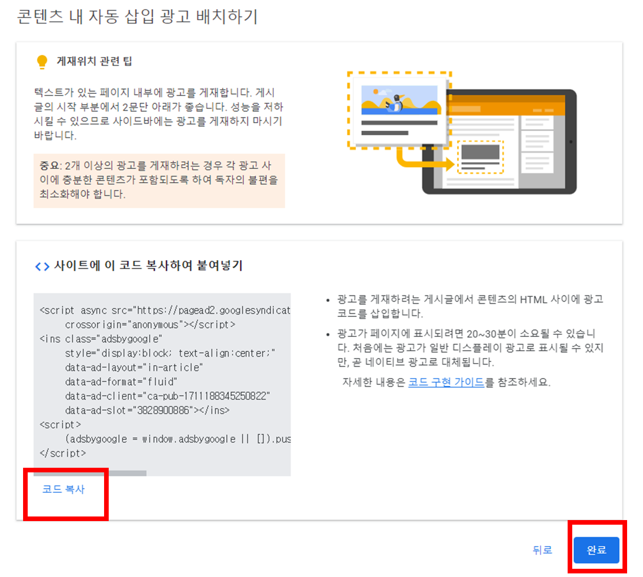 5. 광고 설정 후 저장 및 코드 생성을 눌러줍니다.