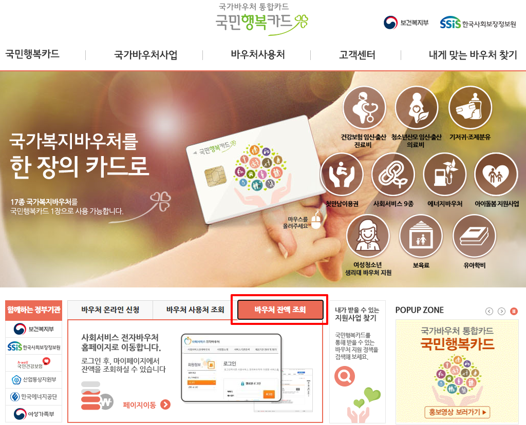 또는 국민행복카드 홈페이지에 접속해서 중간즈음 '바우처 잔액 조회'를 클릭하면 잔액을 조회할 수 있습니다.