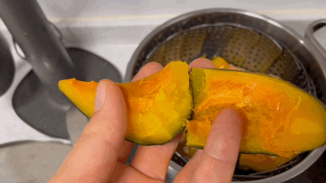 찐 단호박은 부드러워 손으로 쉽게 쪼개집니다. 보기만 해도 촉촉한 맛이 느껴지죠.
