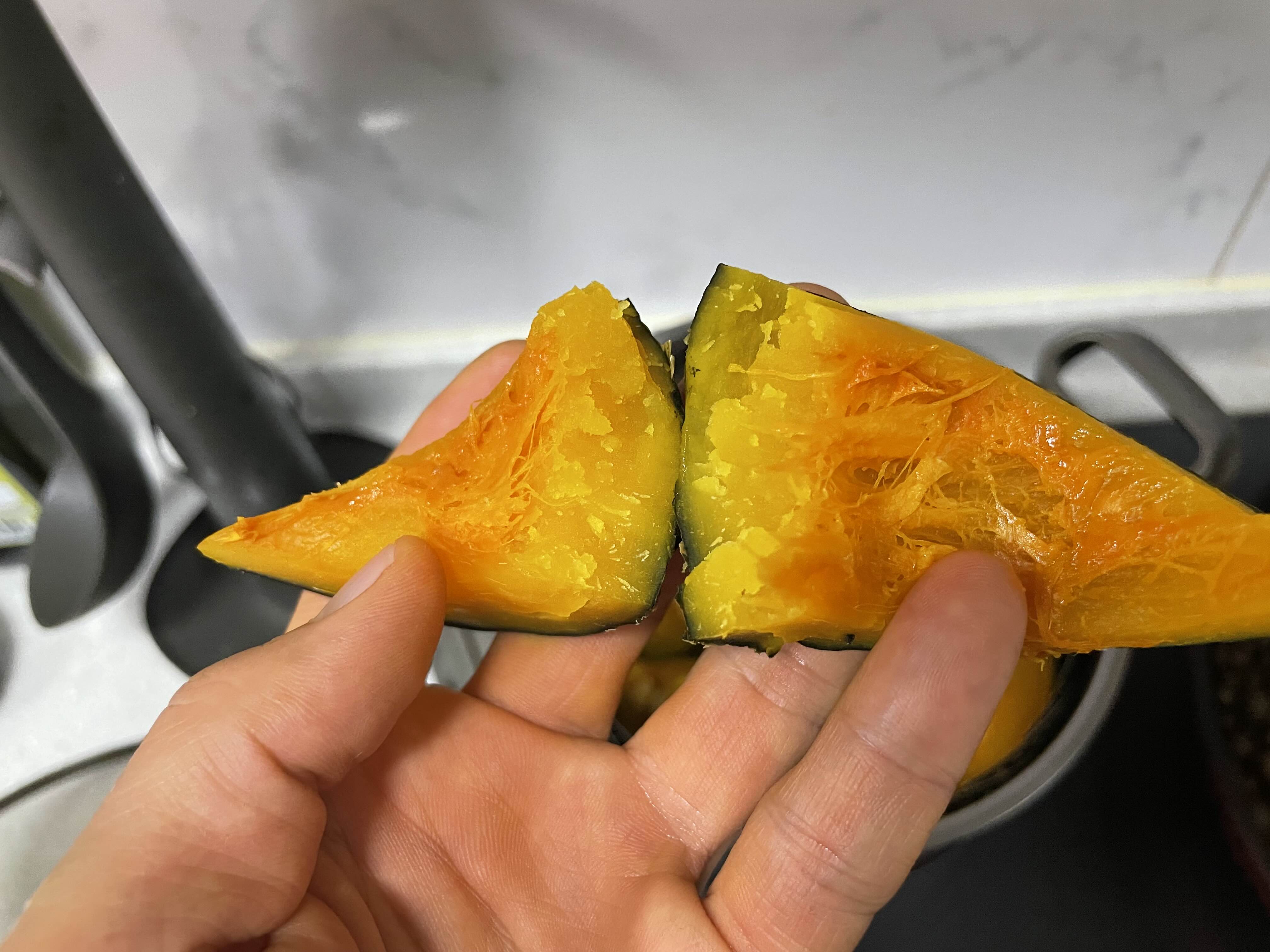 찐 단호박은 부드러워 손으로 쉽게 쪼개집니다. 보기만 해도 촉촉한 맛이 느껴지죠.