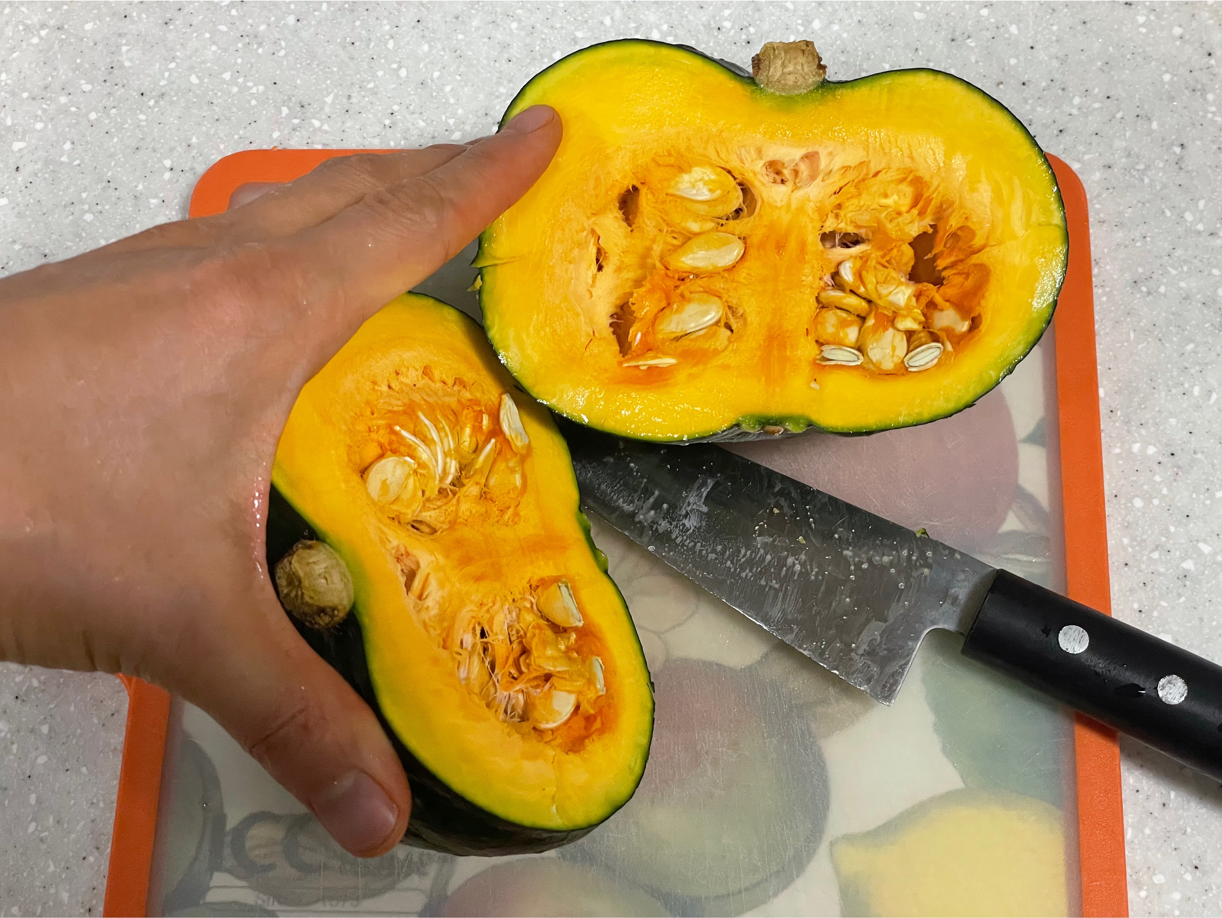 (냉장보관법) 전자레인지에 2분간 돌려준 후 단호박을 반으로 자르고 숟가락으로 씨와 속을 파내고 꼭지를 제거하여 썩는 것을 방지해줍니다. 지퍼백에 넣어 냉장 보관해 줍니다.