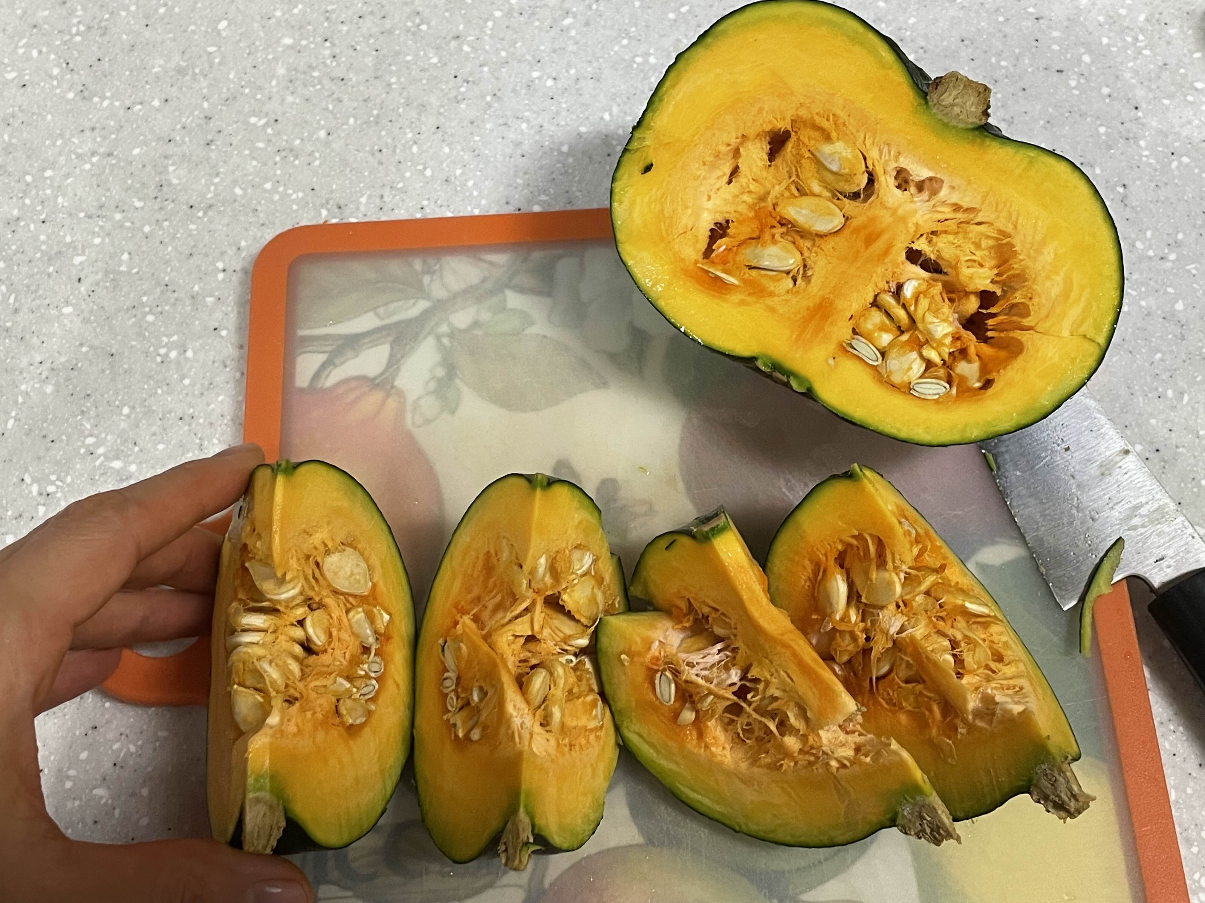 단호박을 먹기 좋게 잘라 줍니다.