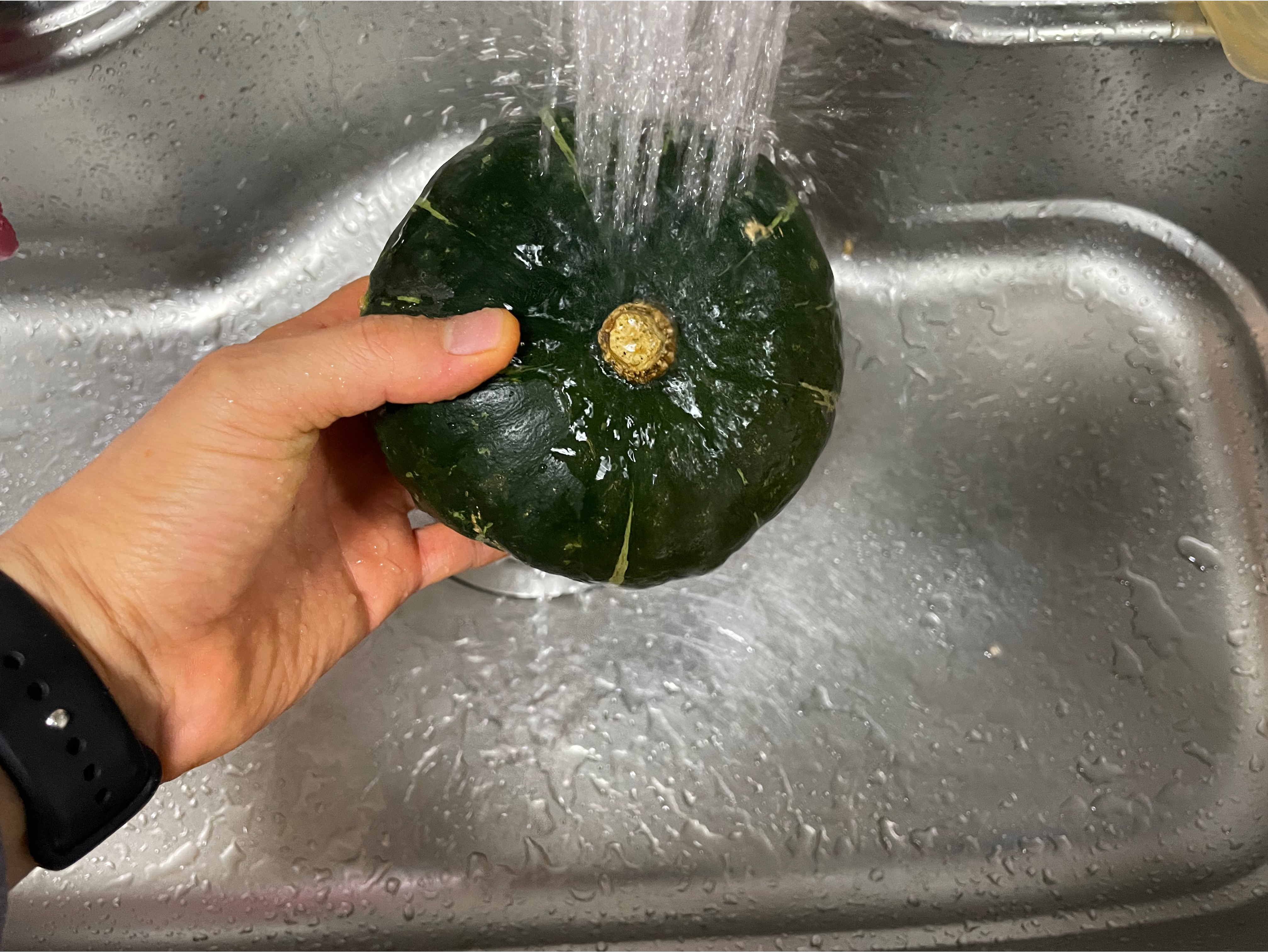 단호박을 흐르는 물에 씻습니다. 농약을 잘 제거하고 싶으신 분들은 물에 10분 정도 담가놓으면 됩니다. 농약은 수용성이기 때문에 물에 녹기 때문입니다.