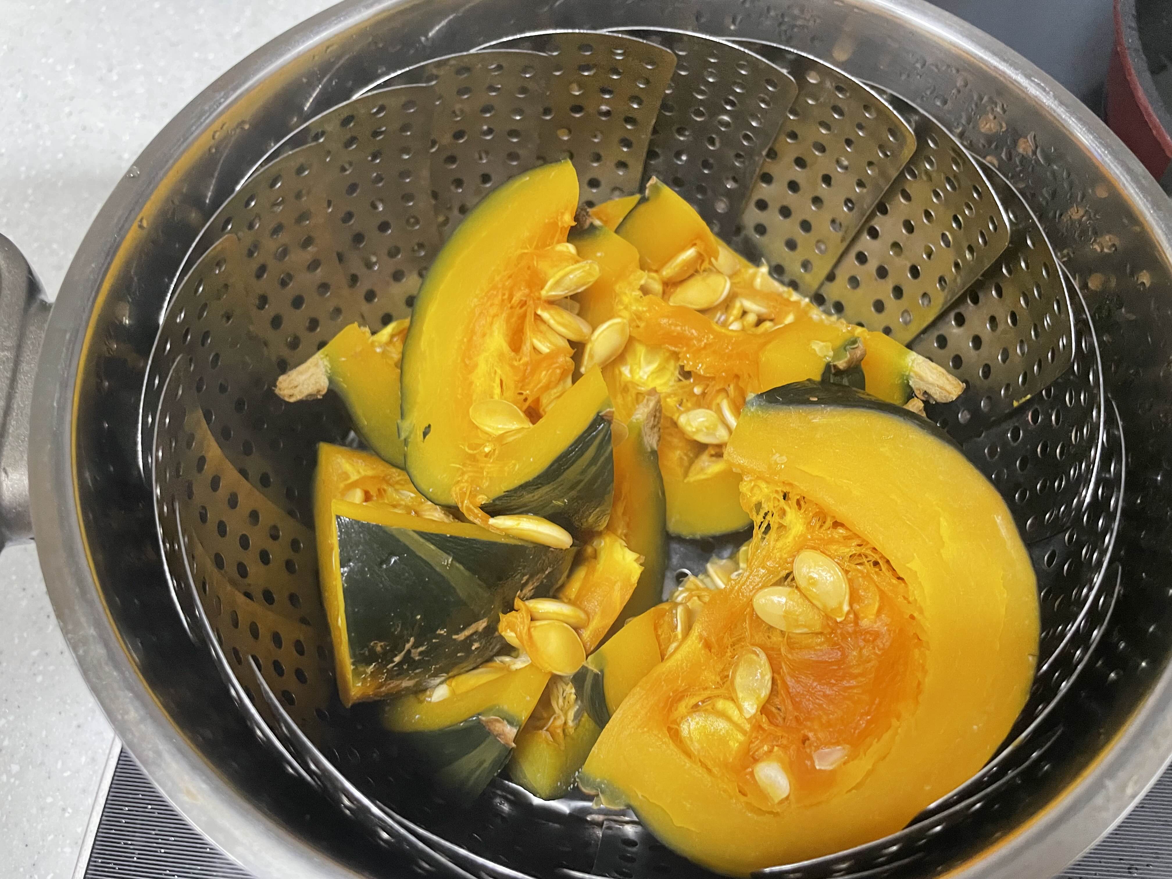 단호박을 찜기에 넣어줍니다. (씨를 제거한 후에 넣는 것이 나중에 먹기 편할 거 같습니다)
