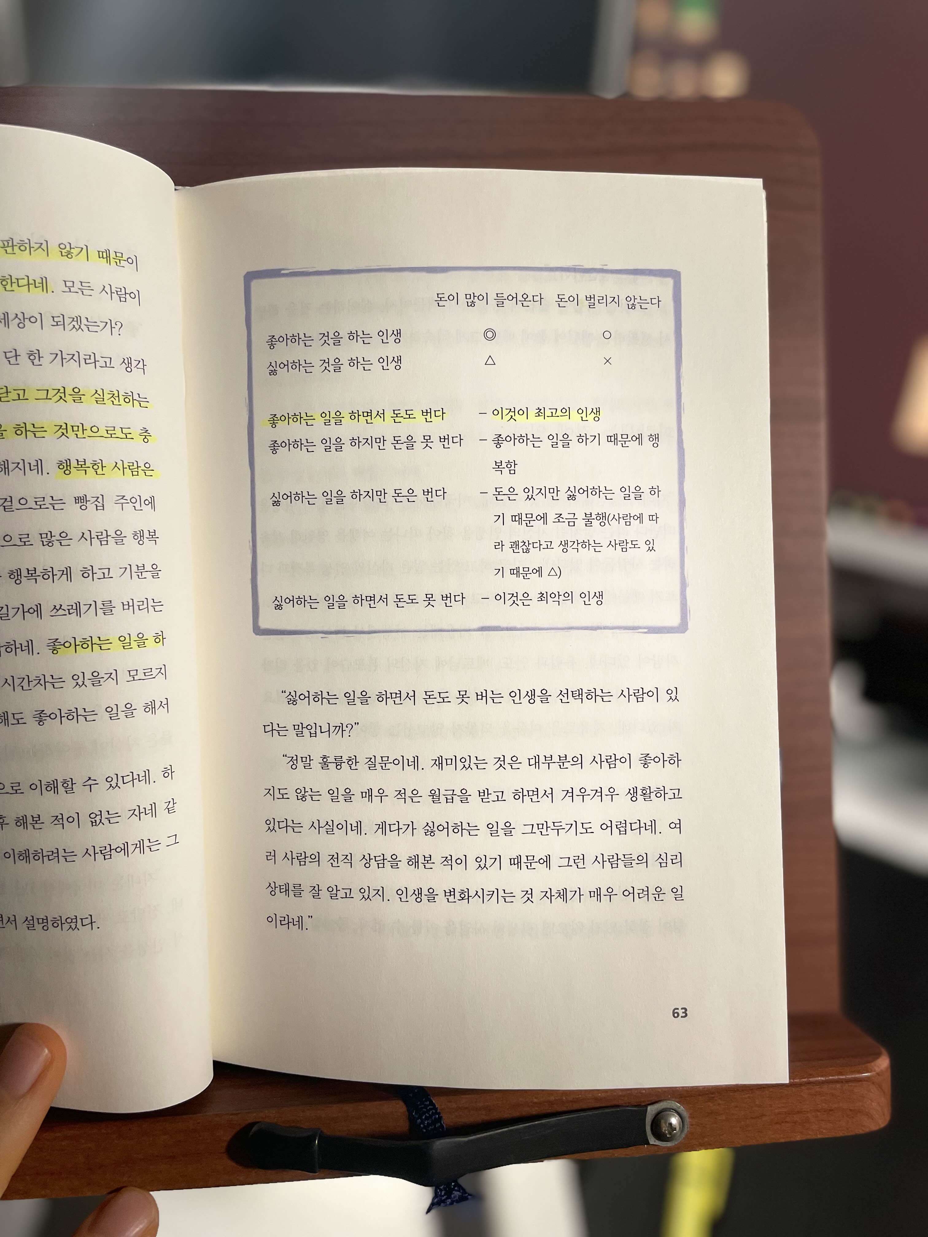 잘하는 일은 두근거리는 느낌이 강해 매우 좋아하는 것처럼 보일 수 있습니다. 하지만 진정 좋아하는 일은 매우 조용하고 진정된 것입니다. 주위 사람들이 알아주지 않아고, 칭찬을 받지 않아도, 돈을 벌지 못해도 오직 그것을 하는 것 만으로 참을 수 없이 즐거워서 시간을 잊고 마는 그런 것입니다. (내가 좋아하는 일이 무엇일까... 아직 저도 잘 모르겠습니다만, 어린시절을 되돌아보면서 조금씩 찾아가려고 노력해야겠다는 생각이 들었습니다) 자신이 싫어하는 일을 직업으로 결정한 순간, 본질적으로는 자신에게 징역형을 선고한 것과 같습니다. 월요일부터 금요일까지 인생의 대부분을 허비하기 때문입니다. 그러고 기분전환을 위해서 쓸데 없는 곳에 돈을 씁니다. 월급을 위자료로 생각하기 때문입니다. 집, 차, 가구, 옷 등등 말이죠. (대부분의 직장인들이 월급을 받아서 주말에 나에게 주는 보상에 써버리는 것 같습니다. 하기 싫은 일을 하기 때문에 힘들고, 보상을 원하기 때문인 것 같습니다. 정말 공감이 가는 내용입니다.)