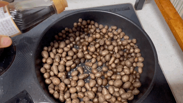 간장을 적당량 둘러줍니다. 진한 맛을 좋아하시면 많이 넣으시고, 아니시면 조금만 넣습니다. 마씨는 생으로도 먹어도 됩니다. 간장은 기호에 맞춰서 넣으시면 됩니다.