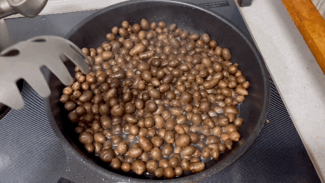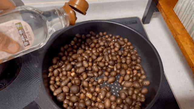 후라이팬에 물을 붓고, 마씨를 넣어서 익힙니다.
