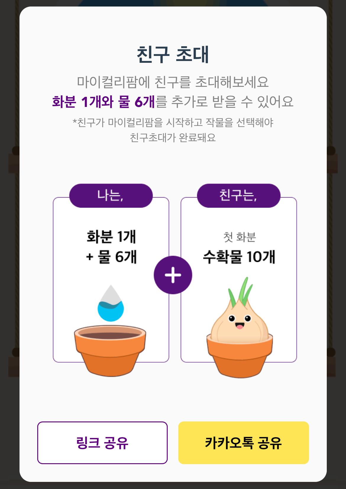 친구를 초대하면 화분 1개 (작물을 하나더 심을 수 있음) + 물 6개를 줍니다