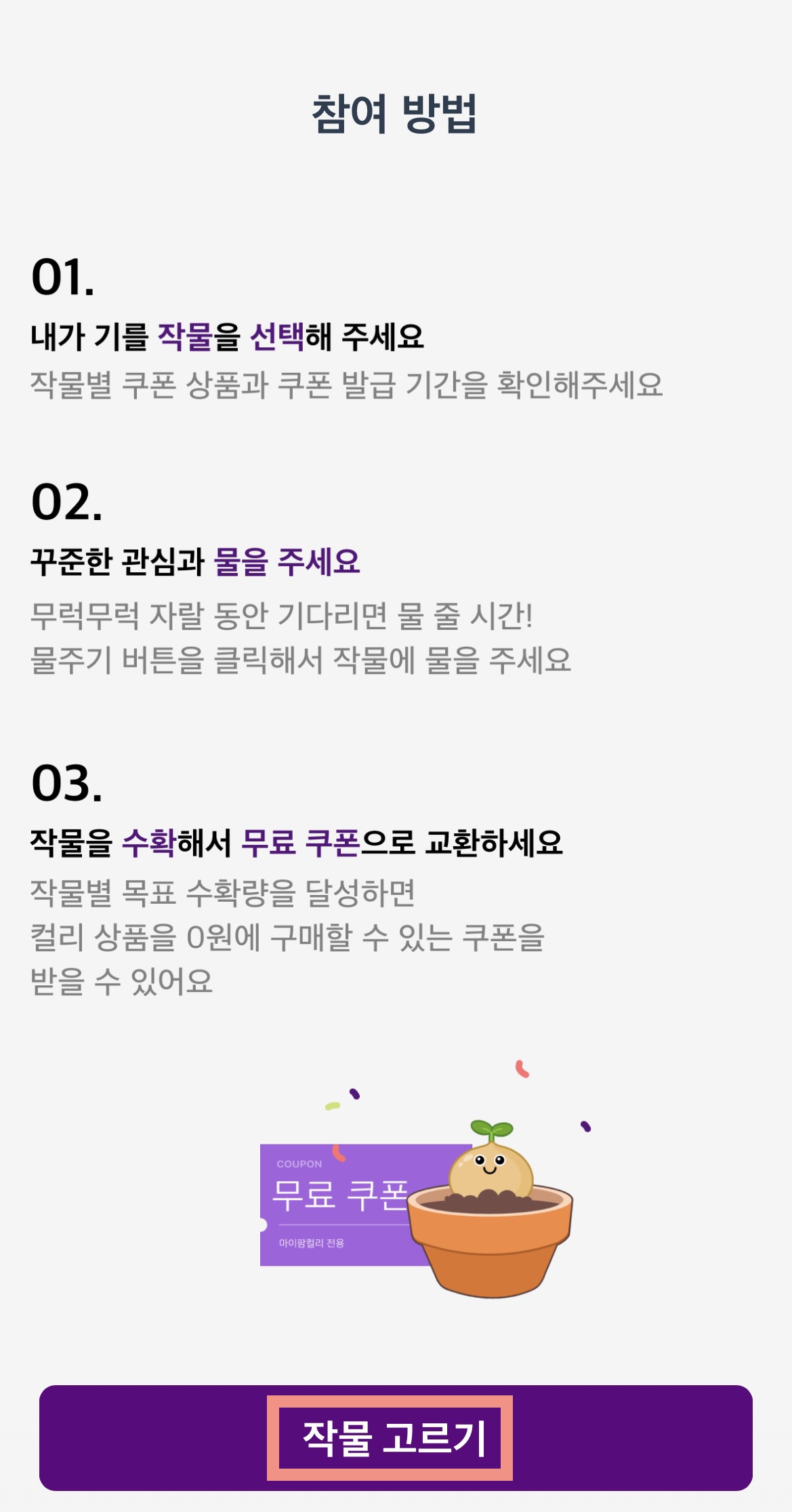 작물을 선택하고 물을 주고, 수확하여 무료 쿠폰으로 교환하면 됩니다. (처음 안내문과 동일한 내용)
