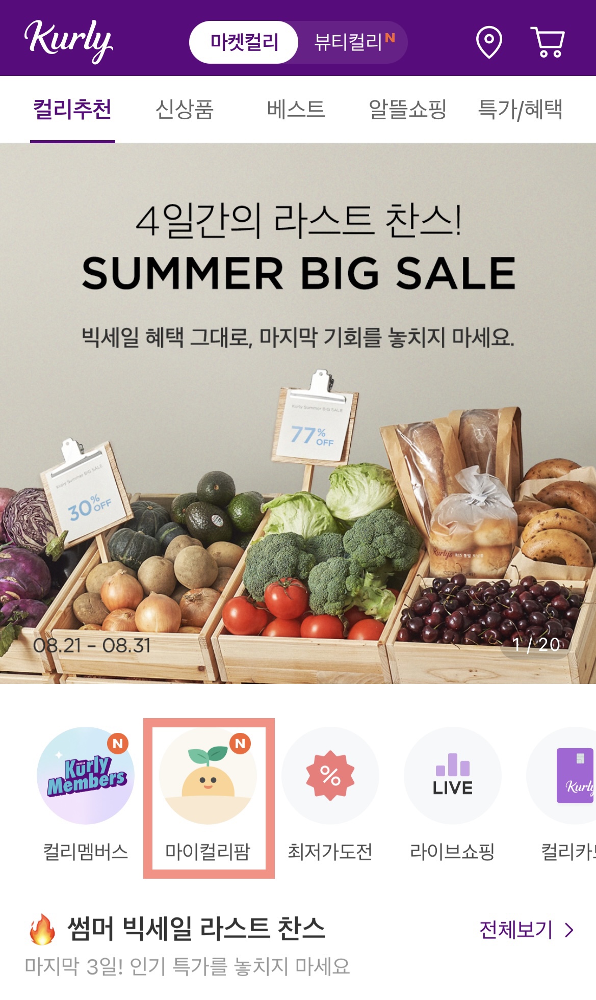 마켓컬리 앱을 켜시면 중간즈음에 '마이컬리팜'이 보입니다