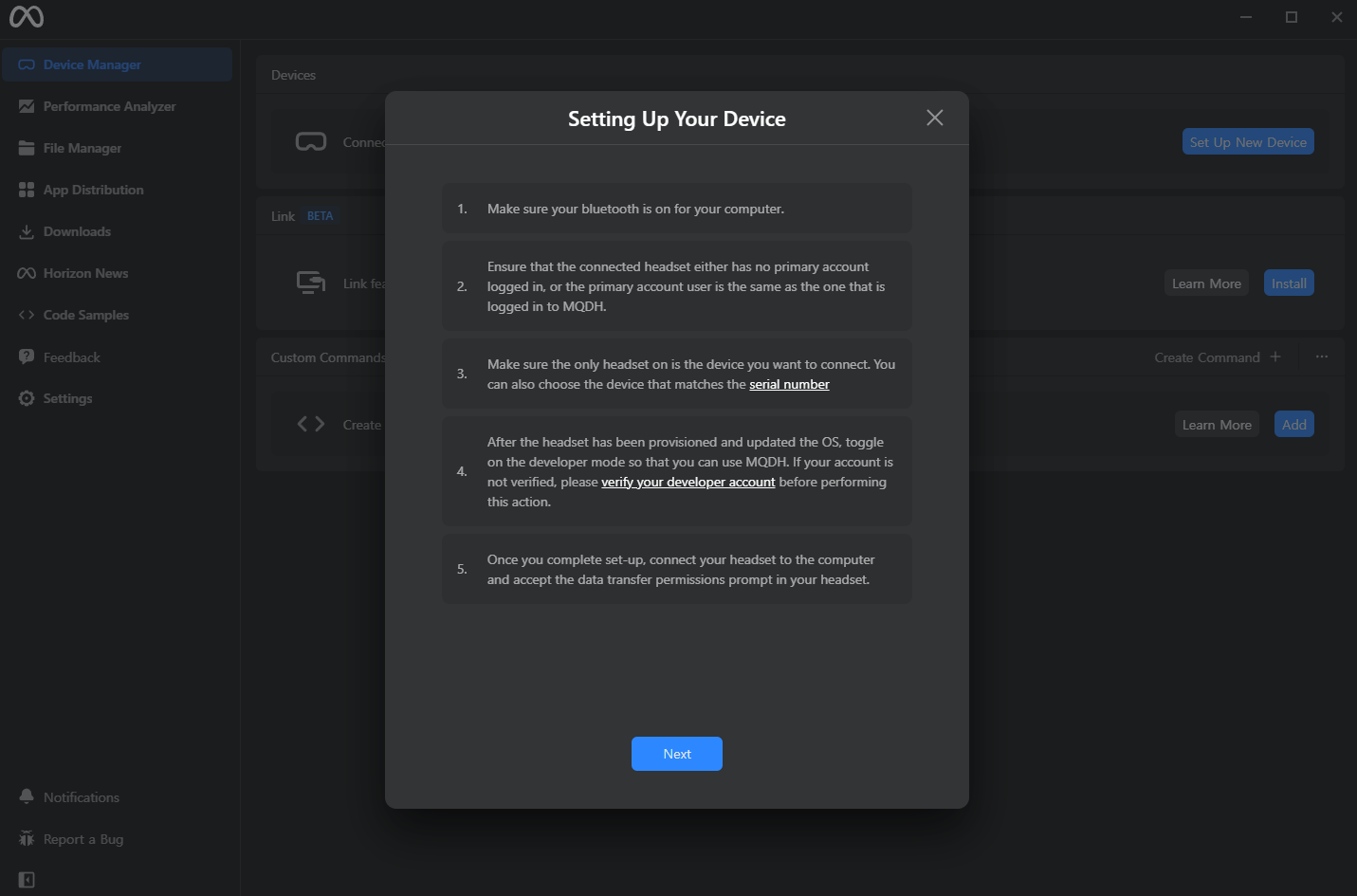 macOS 또는 Windows Meta Quest Developer Hub를 설치해 줍니다.