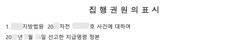 * 집행권원내용은 '지급명령' 결정정본의 내용을 적습니다. (법원명, 사건번호, 선고일자 등)
