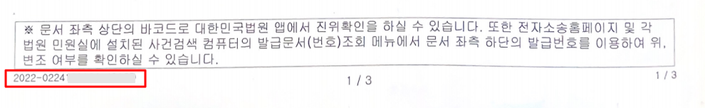 발급번호 5자리를 입력합니다. 발급번호는 지급명령 정본 좌측 하단에 있는 번호입니다. (아래 이미지 참조)