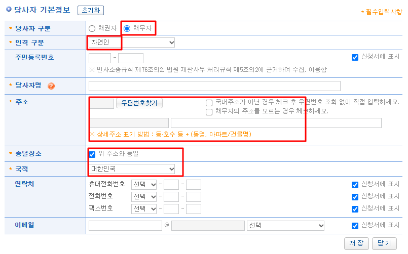 저장 후, '채무자' 선택하여 정보를 입력해 줍니다.