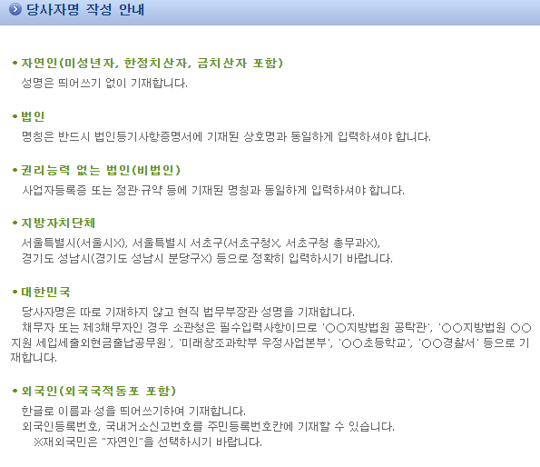 당사자명은 아래 내용을 확인하시어 입력하시면 됩니다.