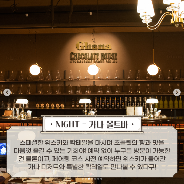 - 애프터눈 티세트, 가나 디저트 위스키 페어링, DIY 초콜릿 클래스는 사전예약이 필요합니다.