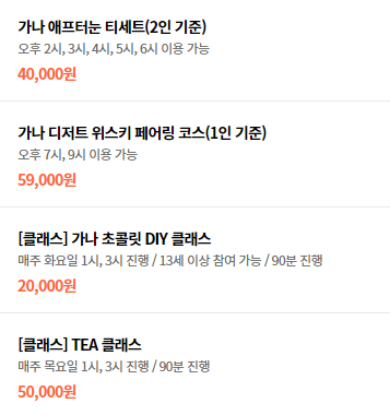 - 애프터눈 티세트, 가나 디저트 위스키 페어링, DIY 초콜릿 클래스는 사전예약이 필요합니다.