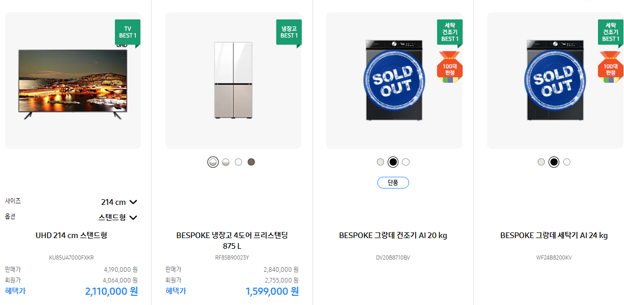 TV, 냉장고, 건조기, 세탁기, 정수기, 스마트폰, 식기세척기, 에어컨, 노트북, 인덕션, 스피커, 청소기 등 다양한 전자 제품을 스페셜 특가로 판매하고 있습니다.