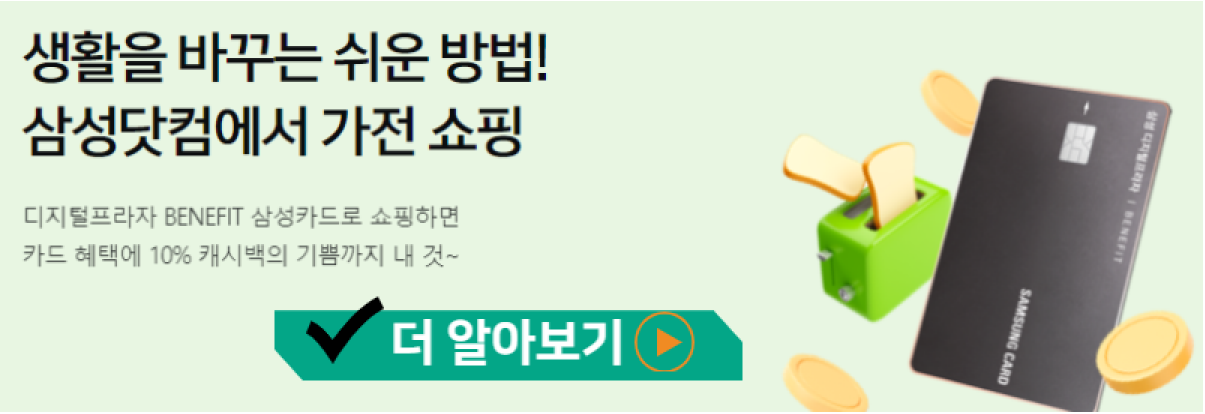 삼성닷컴에서 디지털플라자 BENEFIT 삼성카드로 건별 100만 원 이상 결제 시 10% 캐시백(총 캐시백한도 120,000원) 받을 수 있습니다. 행사기간은 2023.2.1(수)~2.28(화)입니다. 세부 내용은 아래 이미지 클릭하시면 보실 수 있습니다.
