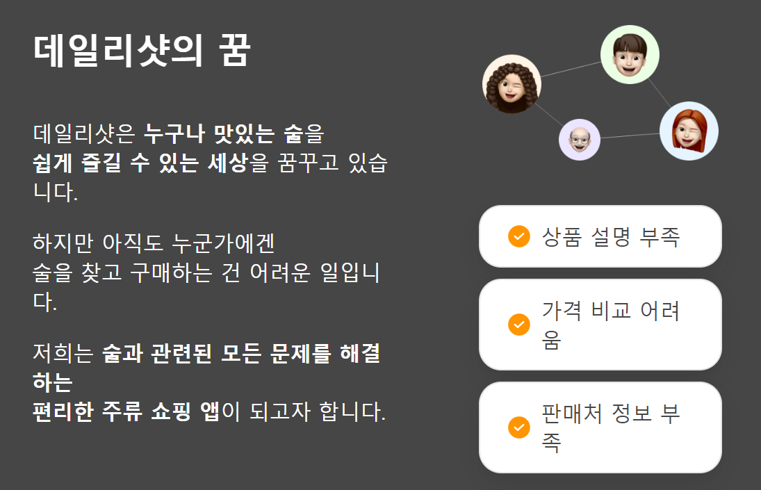 <데일리 샷> 에서는 맛있는 술을 누구나 쉽게 즐길 수 있는 세상을 만들어주는 앱입니다. 술을 찾고 구매하는 번거로움을 쉽고 간편하게 만들어 줍니다. 각 술에 대한 상품 설명과 가격 정보, 판매처 정보까지 한 번에 찾아보실 수 있습니다.