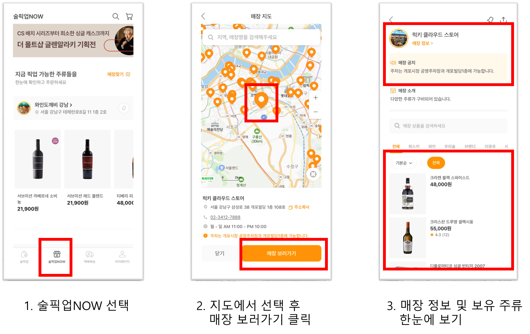 어플 화면에서 원하는 주류를 선택한 후에, 픽업 매장을 선택하고 결제하면 끝입니다. 내가 원하는 술이 내 주위 어느 매장에 있는지 한눈에 알 수 있어서 무척 편리합니다.