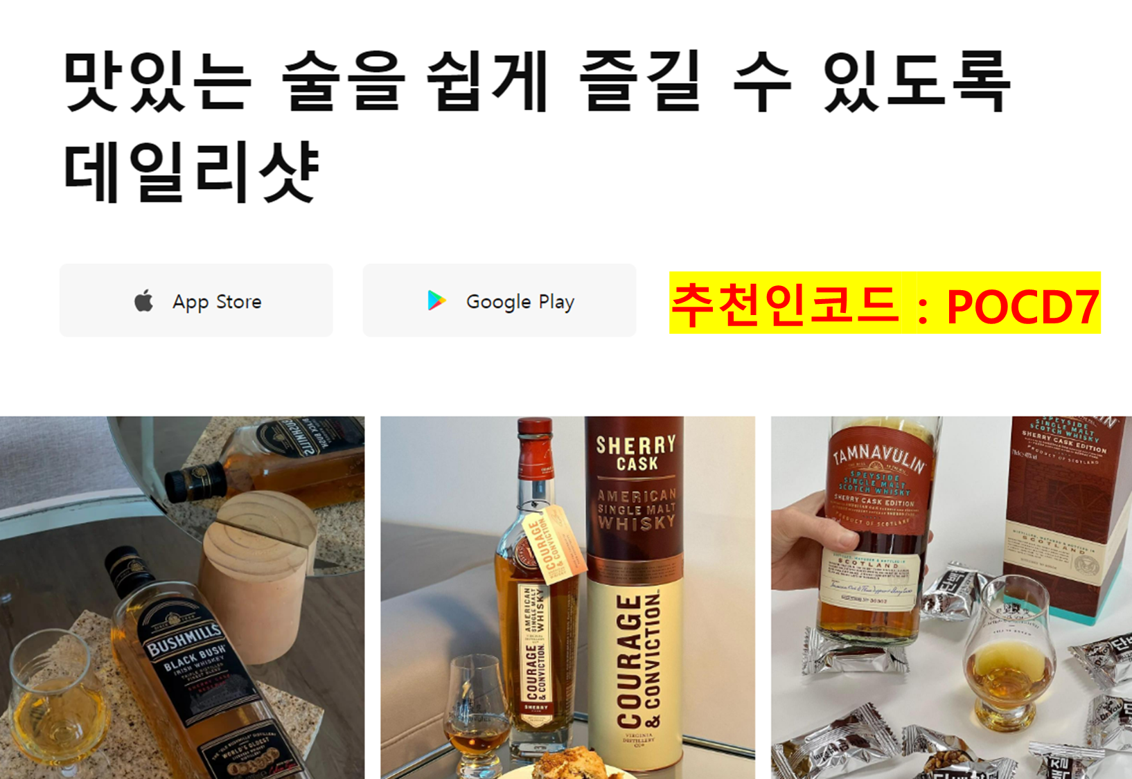 바로 <데일리 샷> 입니다. 추천인 코드(POCD7)를 입력하시면 맛있는 술 5,000원 할인쿠폰을 받으실 수 있습니다.