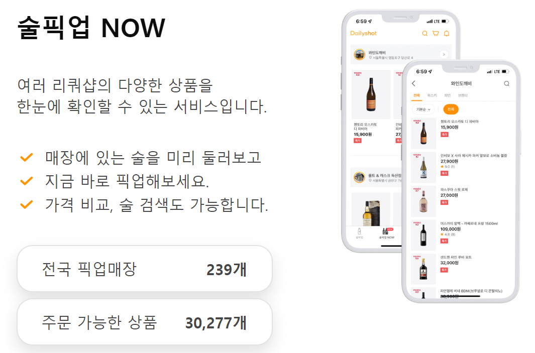 다양한 주류를 어플로 검색해서 알아보고, 합리적인 가격에 주문이 가능합니다. 또한 내 주변 식당에서 픽업이 가능합니다. 원하는 술을 찾아 헤매지 않아도 됩니다.