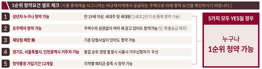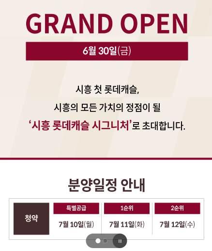 시흥 롯데캐슬 시그니처는 7월 10일(월) 특별공급, 7월 11일(화) 1순위, 7월 12일(수) 2순위 분양을 진행합니다.