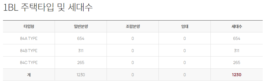 1구역은 총 1,230세대이며 아래와 같이 타입별 세대수가 구성됩니다.
