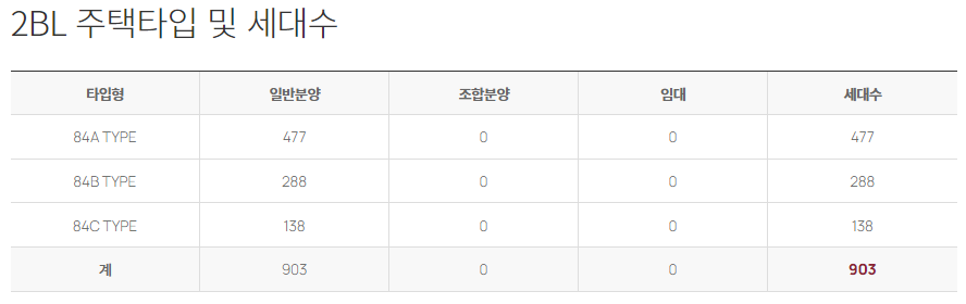 2구역은 총 903세대이며 아래와 같이 타입별 세대수가 구성됩니다