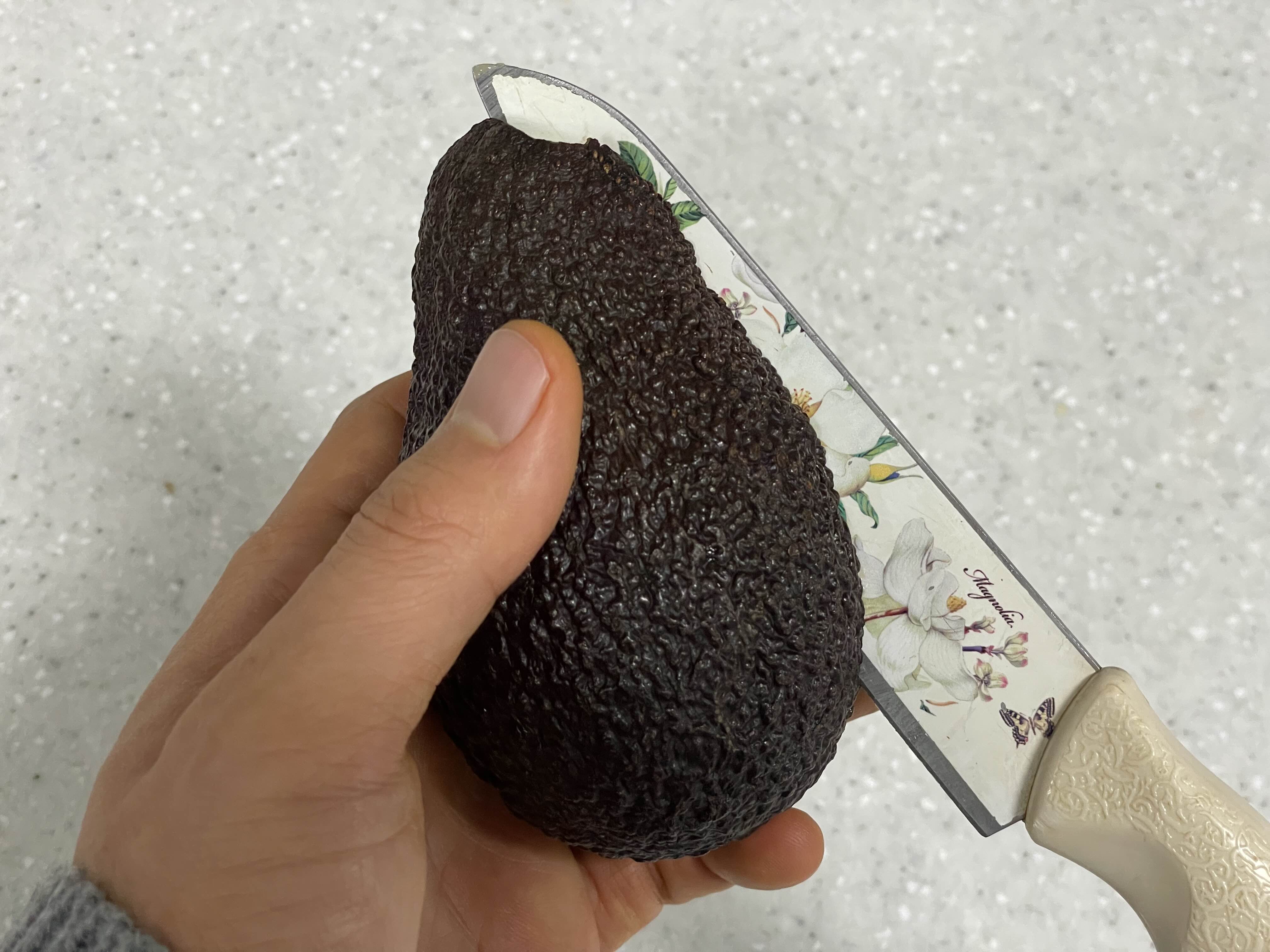아보카도가 구매할 때는 초록색인데요. 상온에서 검은색으로 될 때까지 후숙을 시킨 후에 드시면 됩니다. 아보카드 중간을 칼로 한바퀴 돌려서 칼집을 내줍니다.
