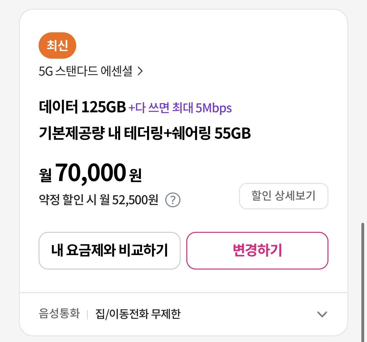 써보고 데이터가 부족하다 싶으면 2,000원을 더 추가하고 '5G 스탠다드 에센셜'로 바꿀 예정입니다.