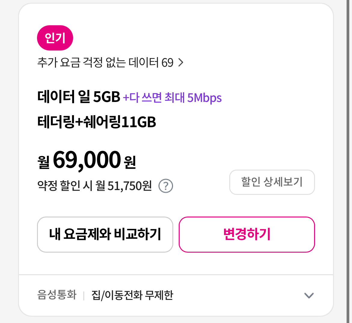 현재 사용하는 LTE 요금제(69,000원)과 크게 차이가 나지 않으면서