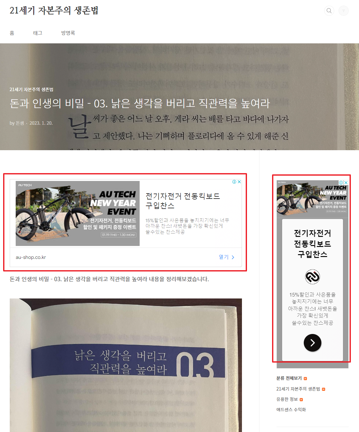 잠시 후에, 내 글을 다시 들어가 보면, 아래와 같이 광고가 정상적으로 나오는 것을 볼 수 있습니다.