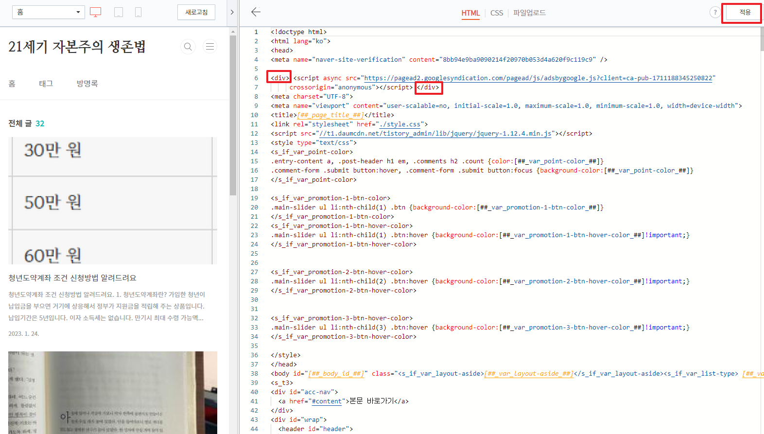 구글 애드센스를 승인받은 상태라면 '구글 광고코드'가 이미 티스토리 html에 들어가 있을겁니다.