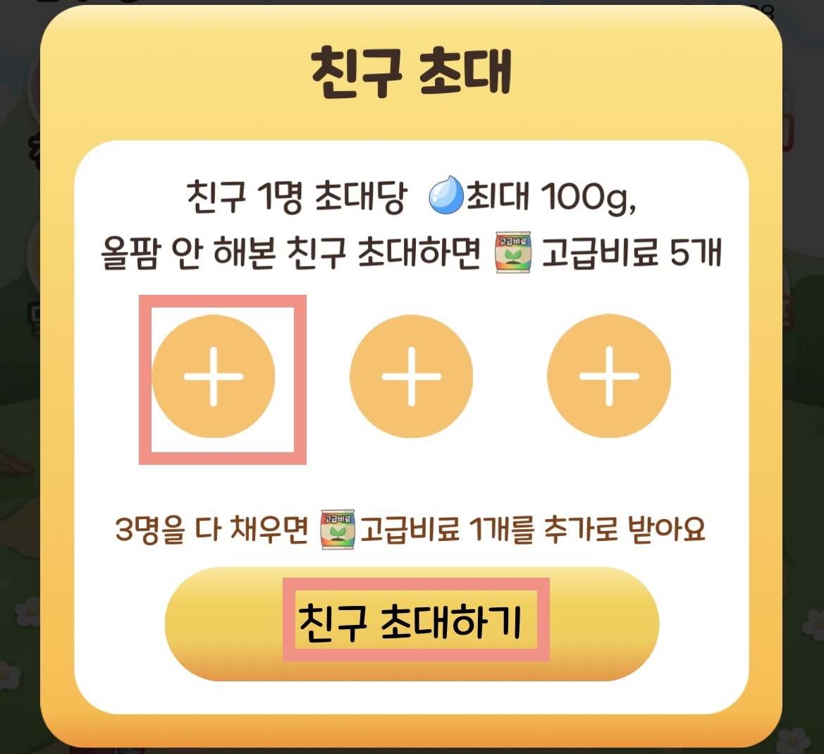 친구초대 시 혜택은 물 100g, 고급비료 5개를 얻을 수 있어요.