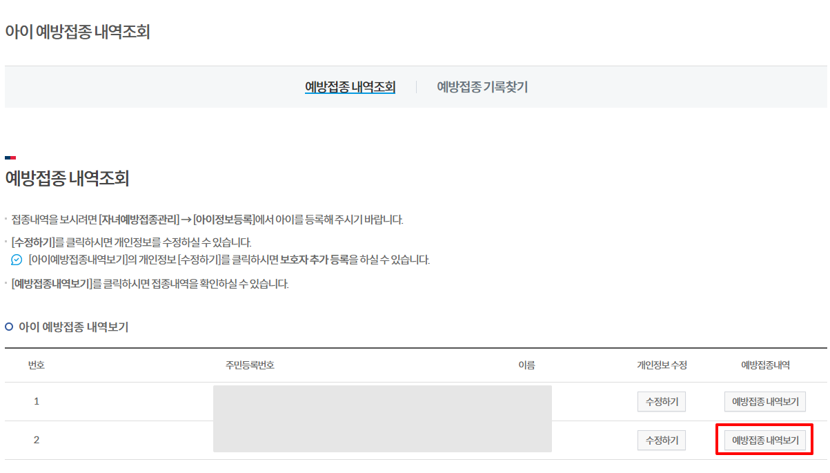 예방접종 관리 > 자녀 예방접종 관리>아이 예방접종 내역조회를 누릅니다.