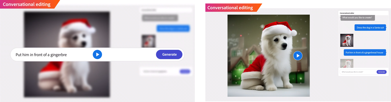 어도비 '파이어 플라이'는 대화형 수정도 가능합니다. 귀여운 하얀색 강아지 한마리가 있습니다.