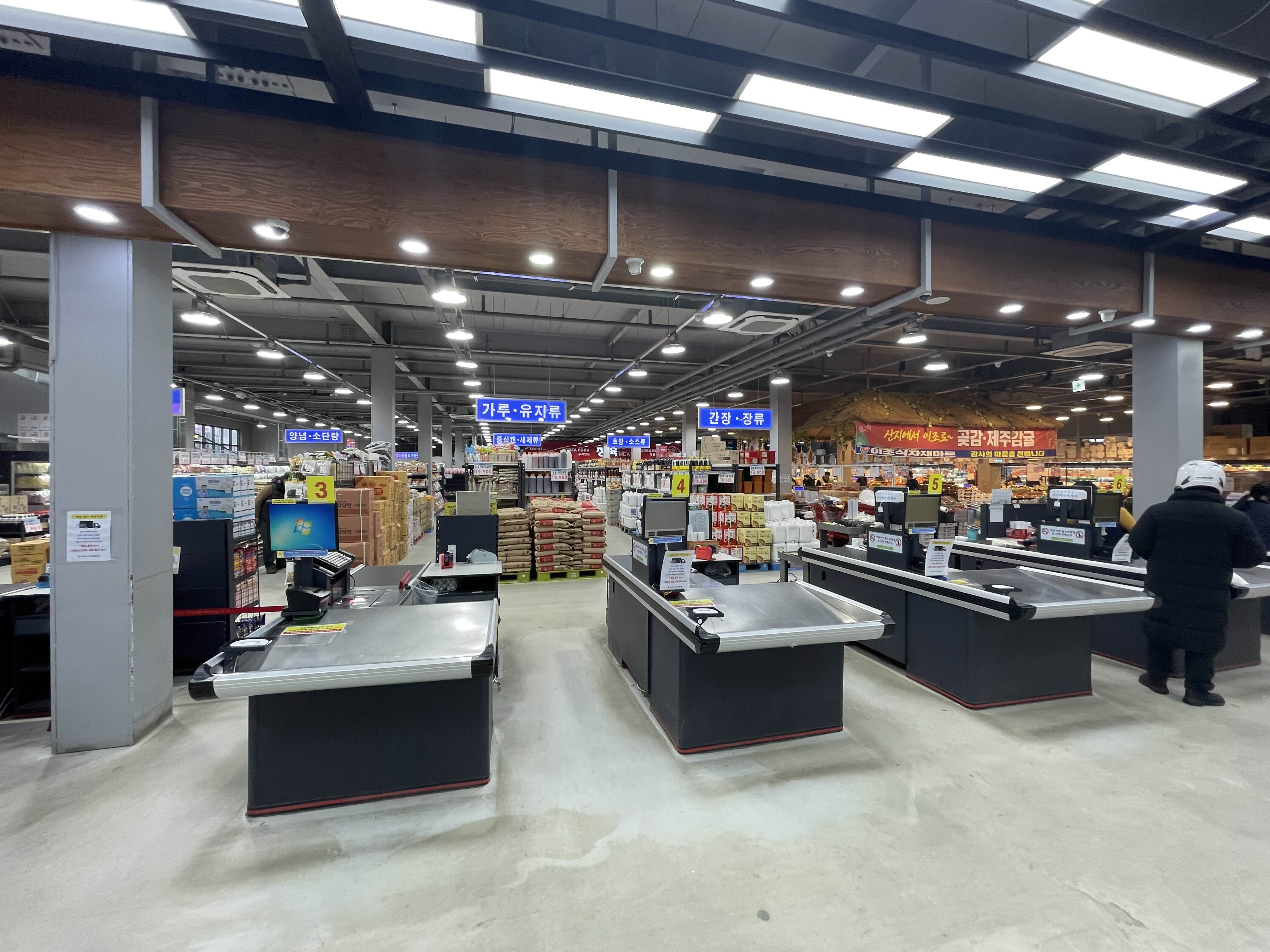 2층 식품코너 계산대 모습입니다. 요즘 홈플러스, 이마트 등 무인 셀프계산대가 늘어나고 있는데요. 셀프계산대는 직접 바코드를 찍어야 하니 불편한거 같아요. 이조식자재마트는 무인계산기가 없습니다. 직원이 직접 계산을 해주니 편리합니다.