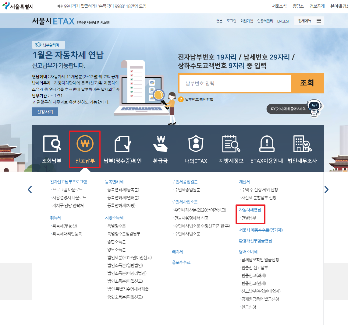 1월 연납 신청 기간에는 서울시 신청이 제한됩니다. 관할지가 서울시인 경우 서울시 이택스(고객센터 : 1566-3900) 또는 관할 자치단체로 신청하셔야 합니다.