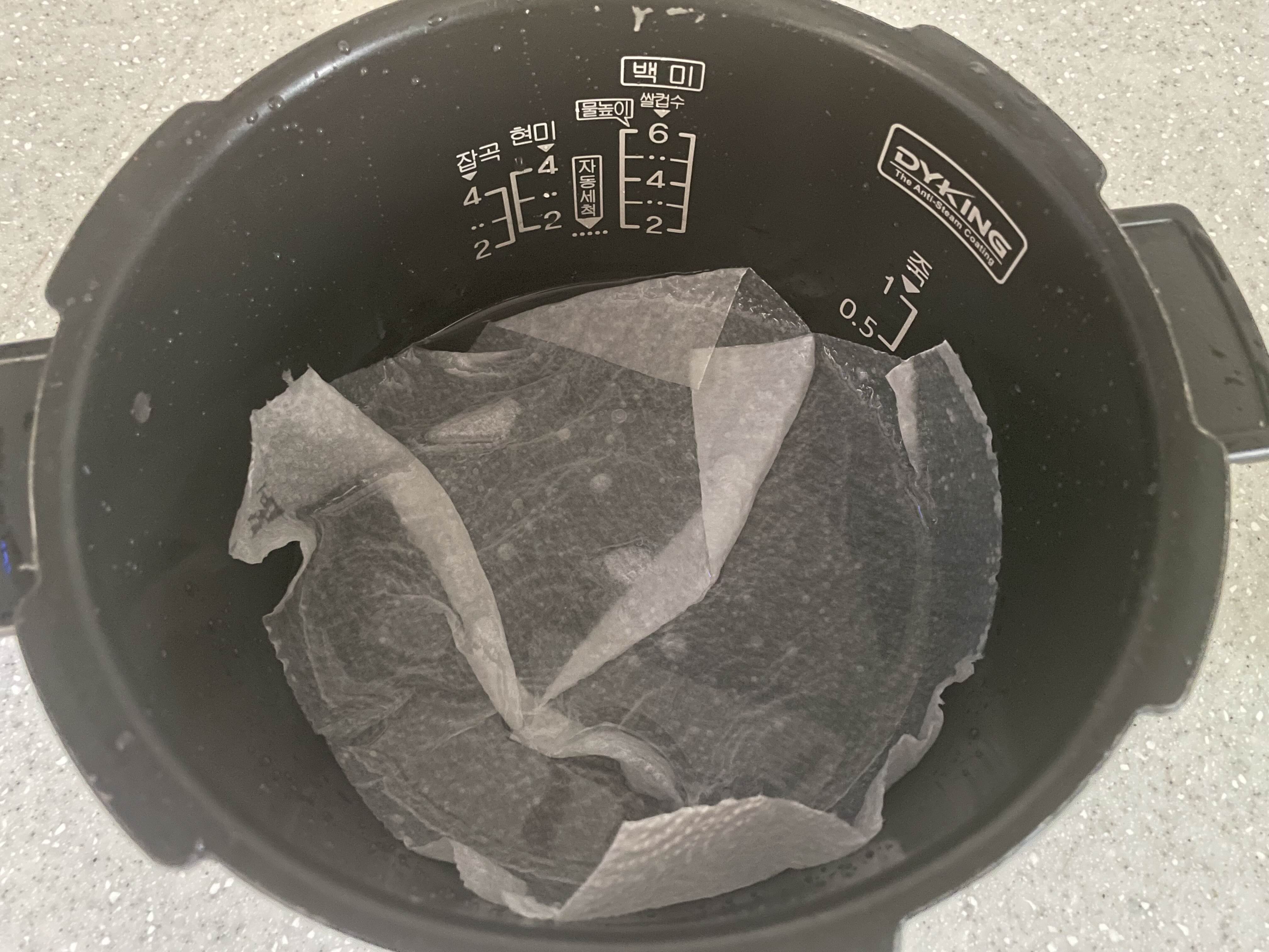 키친타월을 전기압력밥솥 아래에 깔아줍니다.
