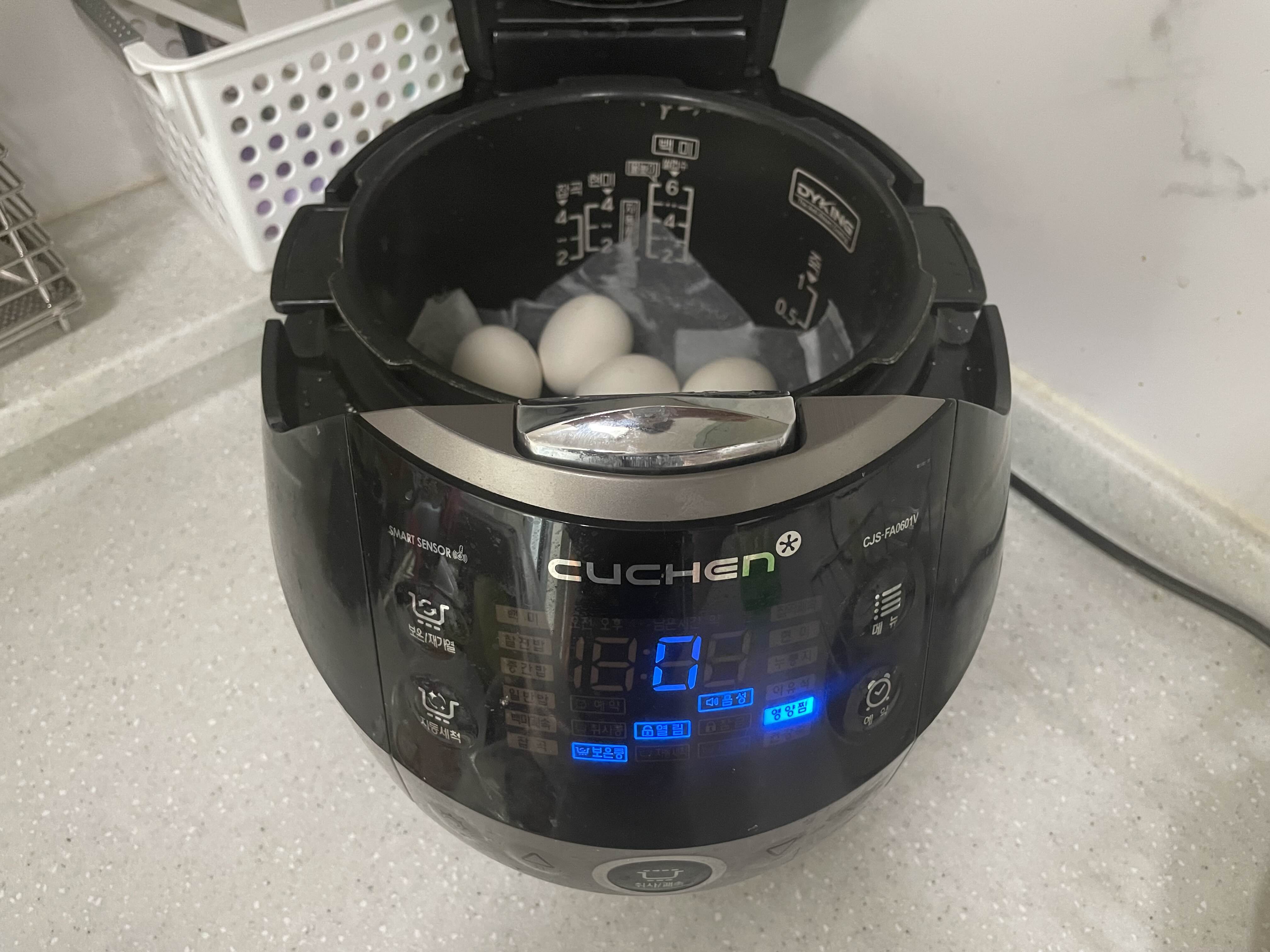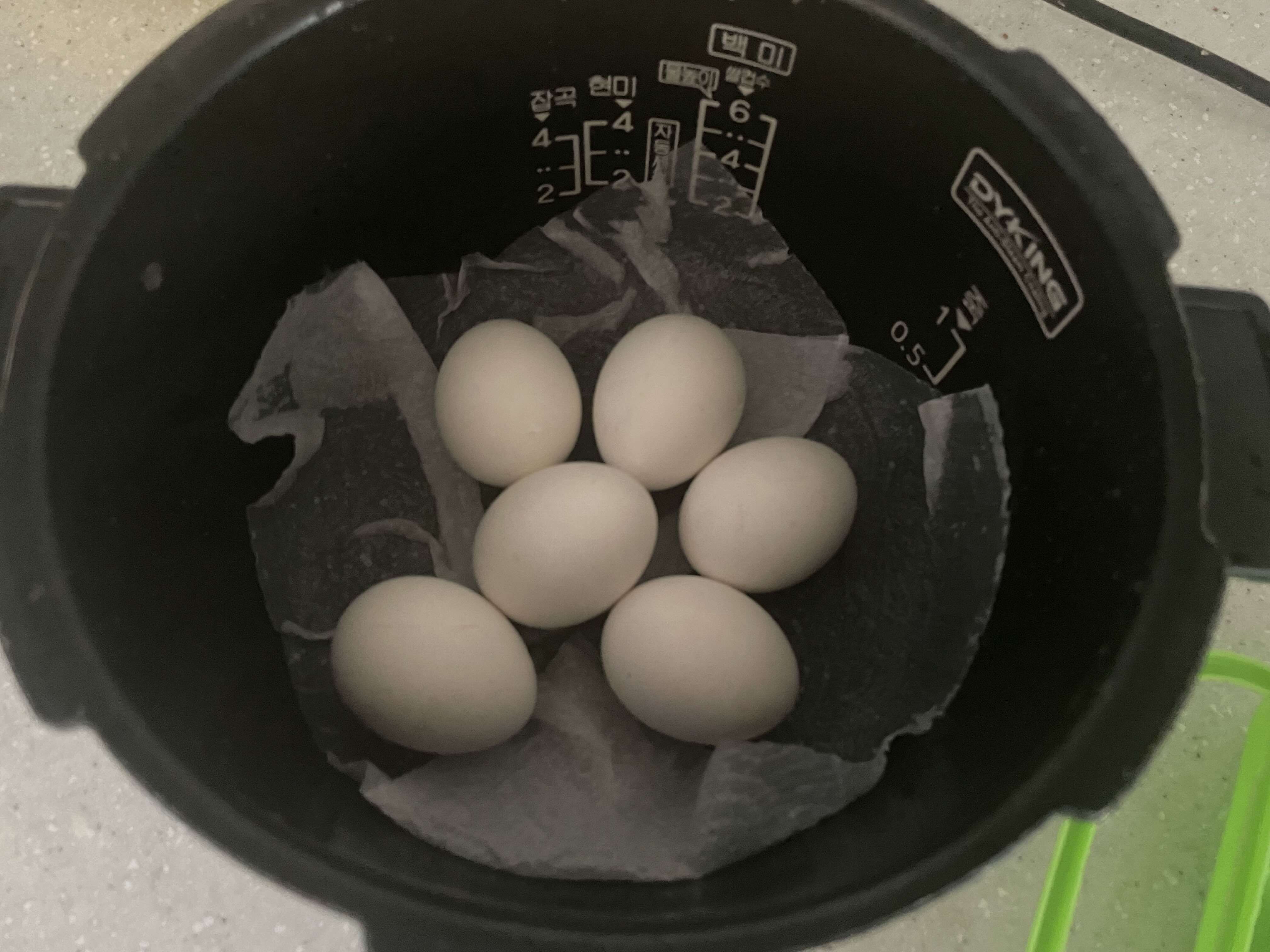 계란을 흐르는 물에 한번 씻어주고 (굳이 안씻어줘도 무방), 전기압력밥솥에 살살 넣어줍니다.