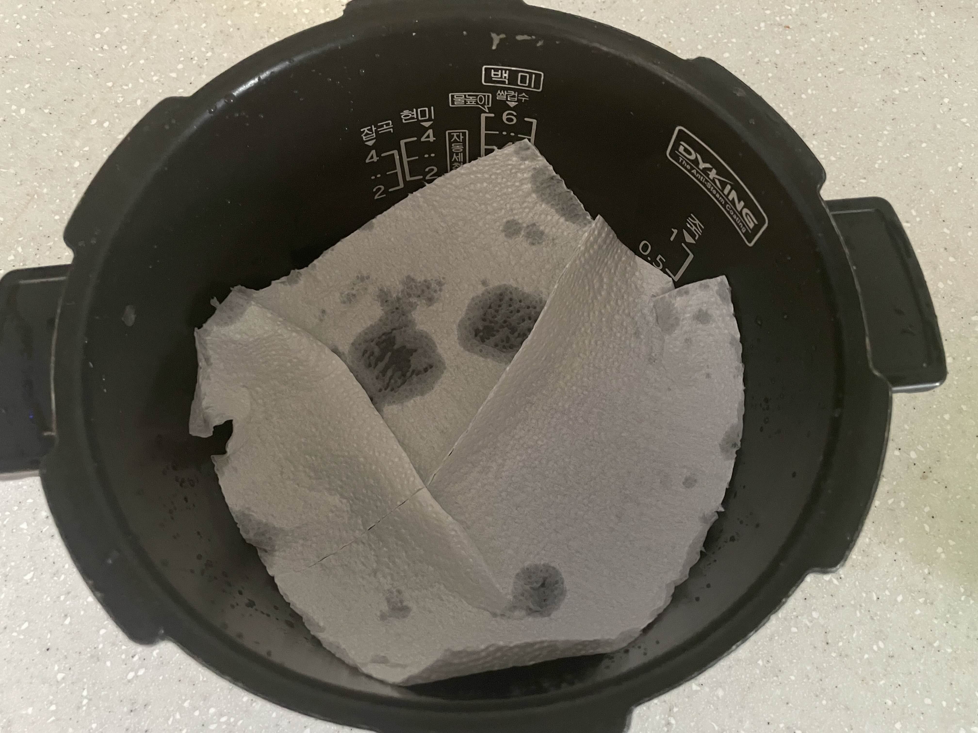 키친타월을 전기압력밥솥 아래에 깔아줍니다.