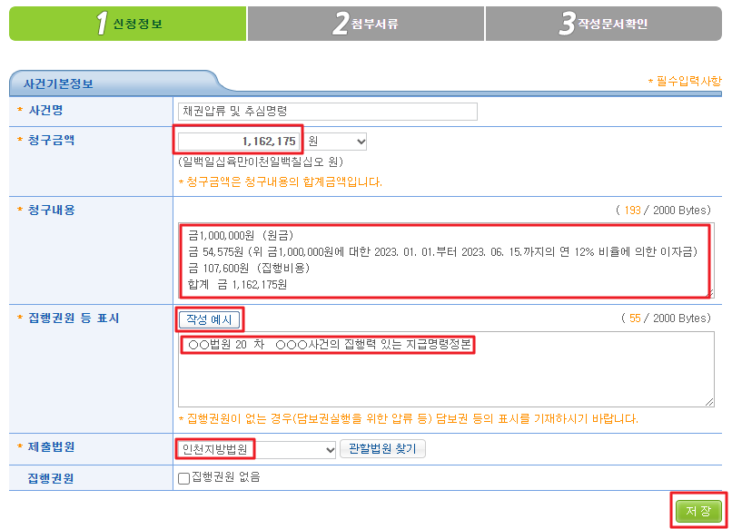 * 청구내용을 입력합니다. 청구내용은 원금 + 이자 + 집행비용 모두를 적습니다.
