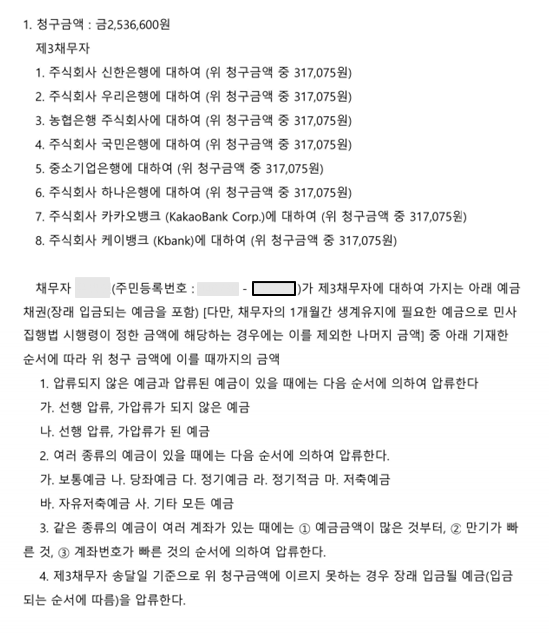 또한 채무자가 주로 이용하는 은행 한곳을 제3채무자로 등재하면, 채무자는 다른 은행을 계좌개설해서 사용할 수 있기 때문에 아예 처음부터 주요 은행 (8곳 이상)을 모두 제3채무자로 한번에 등재하는 것을 추천드립니다.