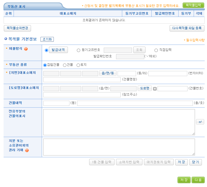 필요한 경우 입력하고, 부동산 관련이 아니면 넘어갑니다. (지급명령은 금전 관련이므로 부동산 표시 입력은 넘어갑니다)